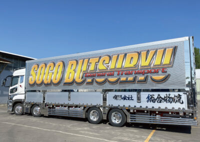 従来のラッピングフィルムを車両に貼る方法よりもはるかに低価格で施工期間も短縮でき、リベット周りやウィングとアオリの段差に関係なくプリントできるので繋ぎ目、切り込みなくきれいに仕上がります。